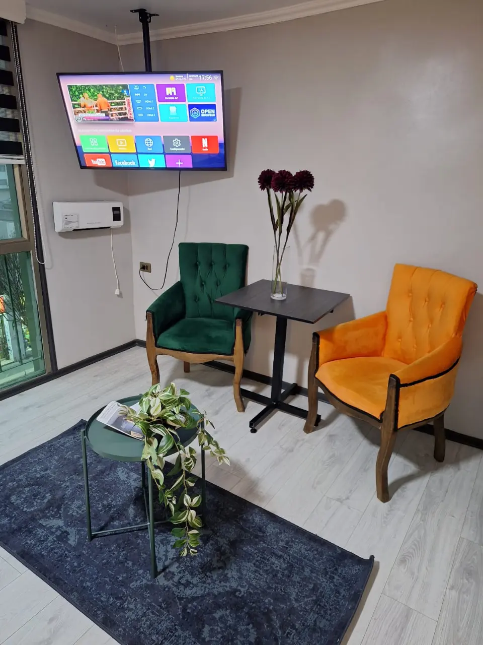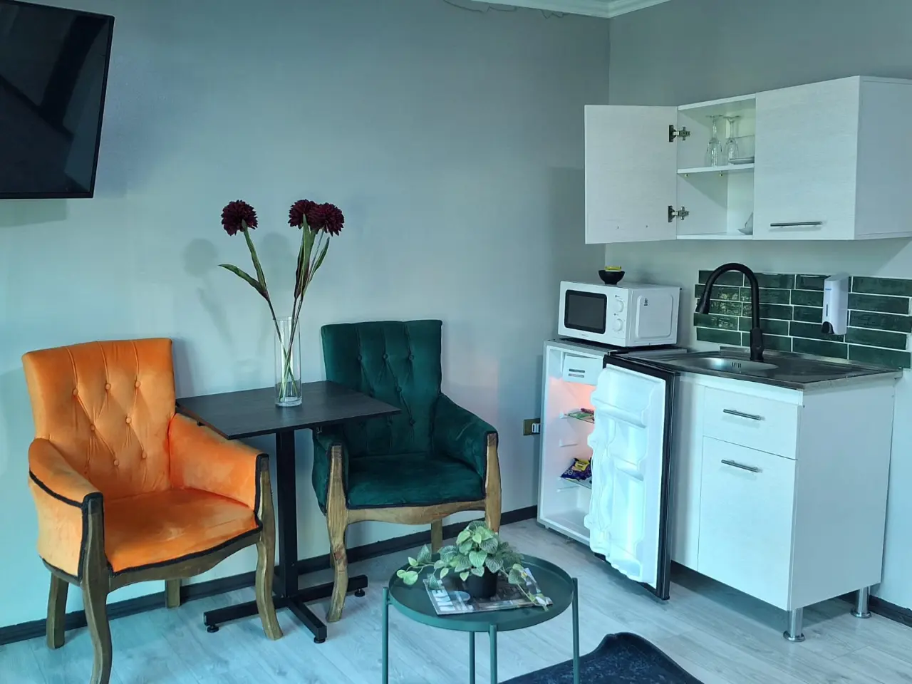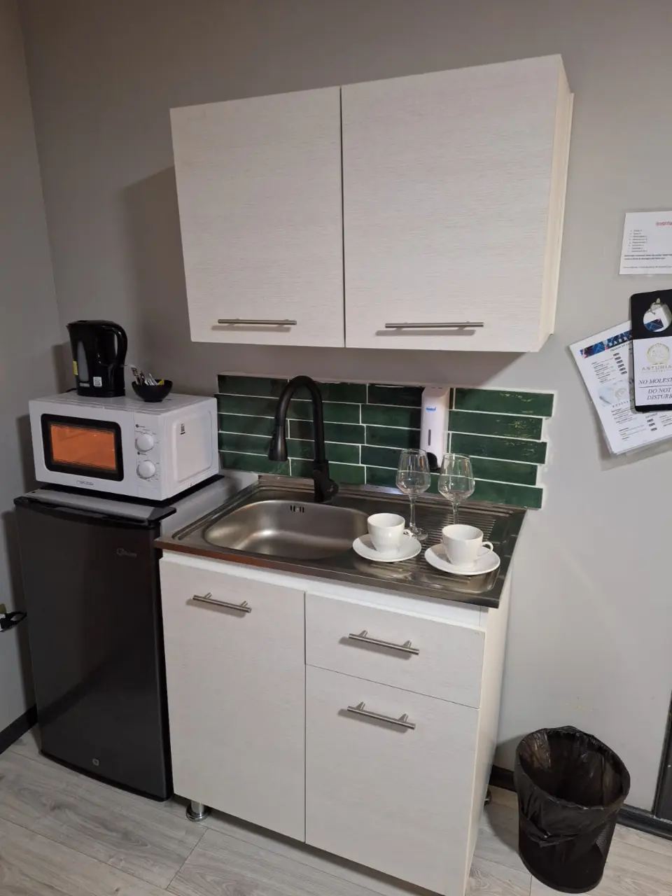 * hervidor, tazas, te, café y azúcar, aguas, snacks y  golosinas.